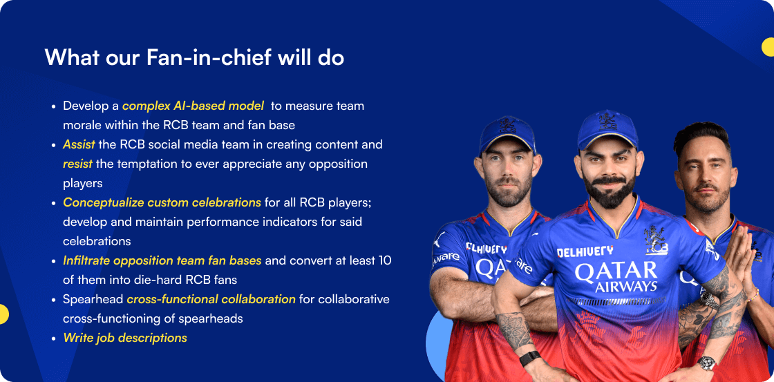 If you’re nodding your head in agreement to the questions above, then you might just have what it takes to be the Fan in Chief at RCB. Here’s a breakdown of the qualities they’re looking for: (The Coolest Job Ever Become the Fan in Chief of RCB Step-by-Step Process 2024)